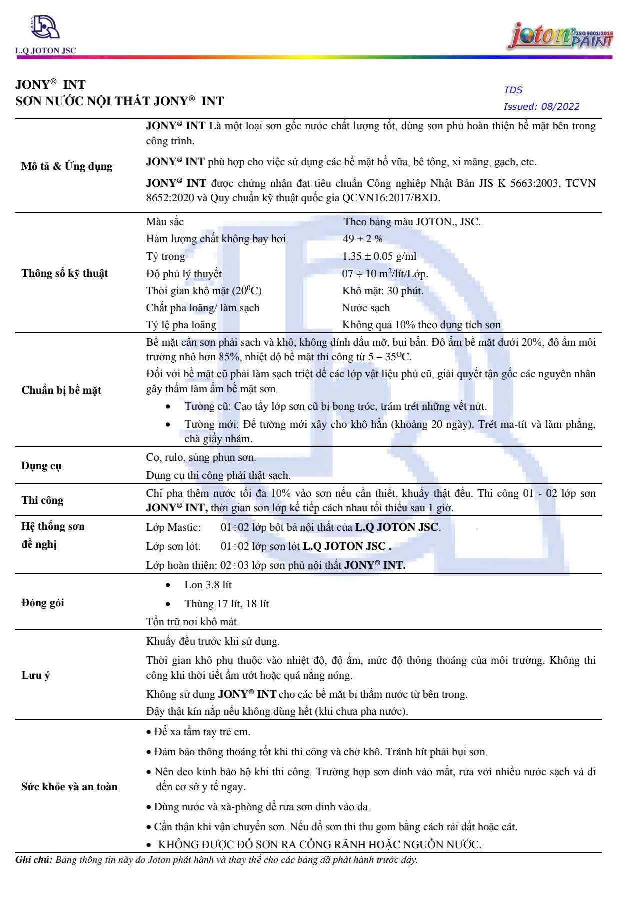 JONY® INT được chứng nhận đạt tiêu chuẩn Công nghiệp Nhật Bản JIS K 5663:2003, TCVN 8652:2020 và Quy chuẩn kỹ thuật quốc gia QCVN16:2017/BXD.